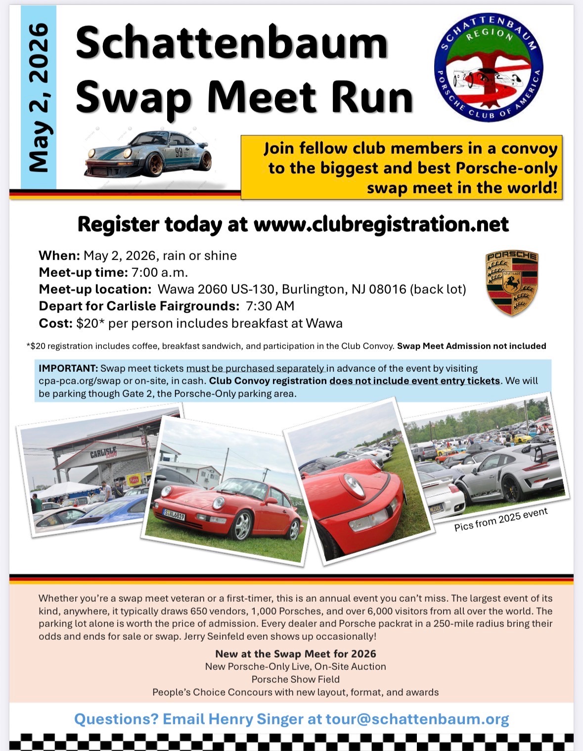 Cost: $20 per person, which includes coffee, breakfast sandwich, and participation in the Club Convoy. Swap Meet Admission not included. Register for the Schattenbaum Club Convoy at https://clubregistration.net/events/signUp.cfm/event/16936.